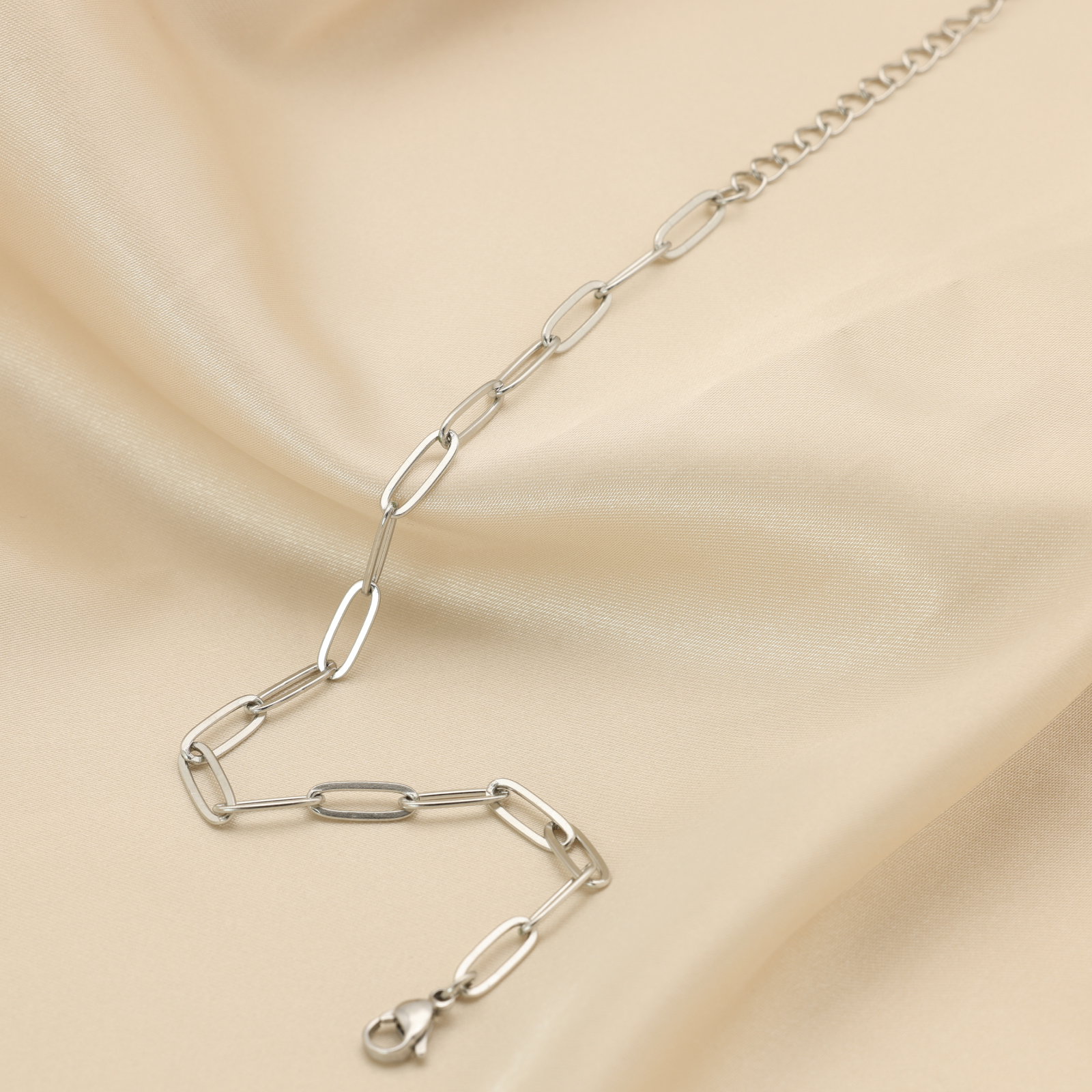 スタイリッシュな細長リンクが連なるペーパークリップチェーン(細長リンクチェーン)はシンプルながらも圧倒的な存在感を放つデザイン。4.4mm幅のすっきりとしたシルエットが足元に抜け感と都会的な印象をプラスします。無駄のないラインと洗練された光沢がどんな装いにもモダンなアクセントを添えてくれます。