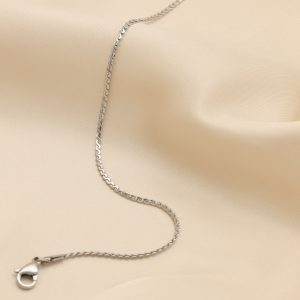 モダンでミニマルなスクエアボックスチェーンが足元に上品な印象を与えるステンレス製アンクレット。細めの2.5mm幅チェーンが軽やかでシンプルながらも洗練された雰囲気を演出します。カジュアルにもエレガントにもマッチする万能デザインです。