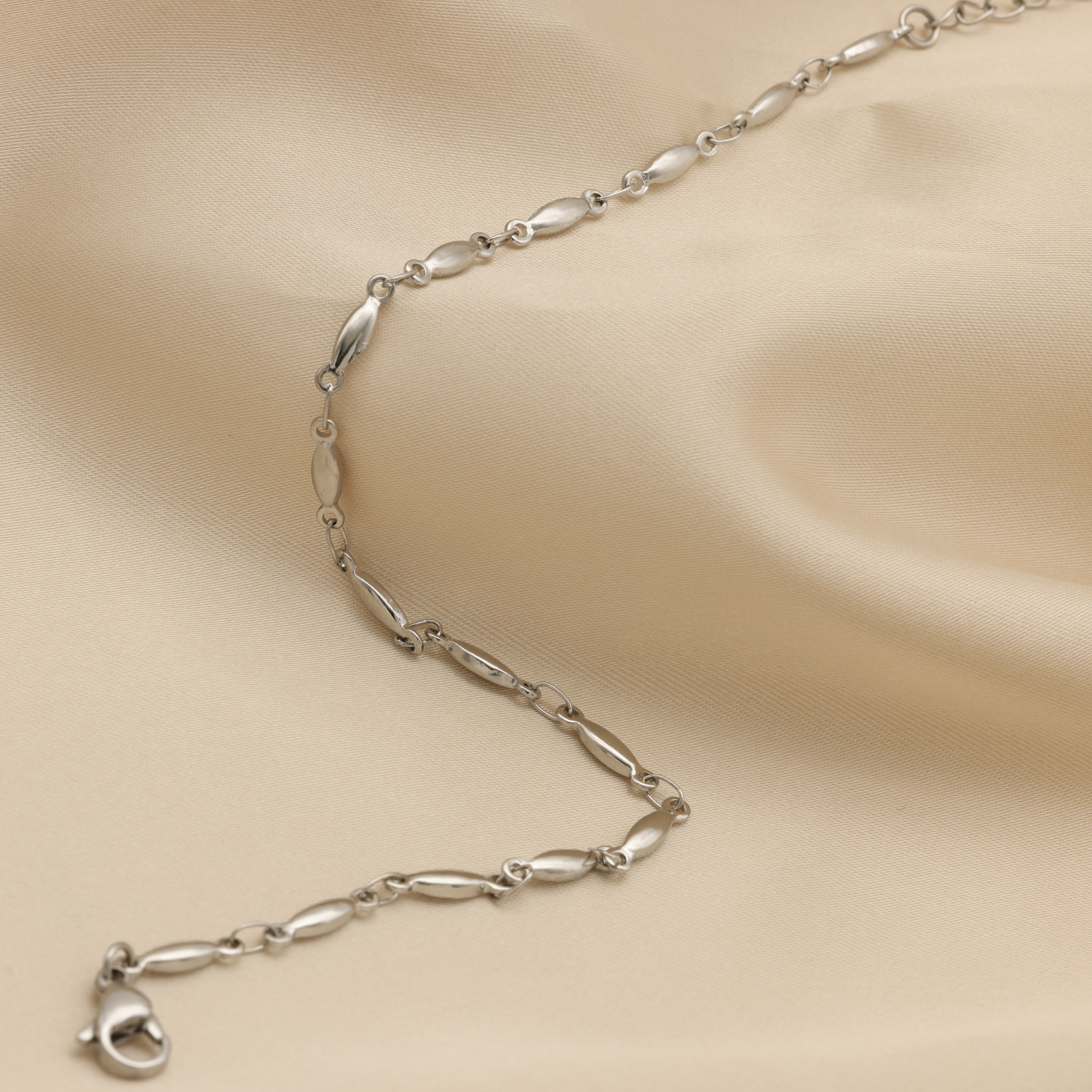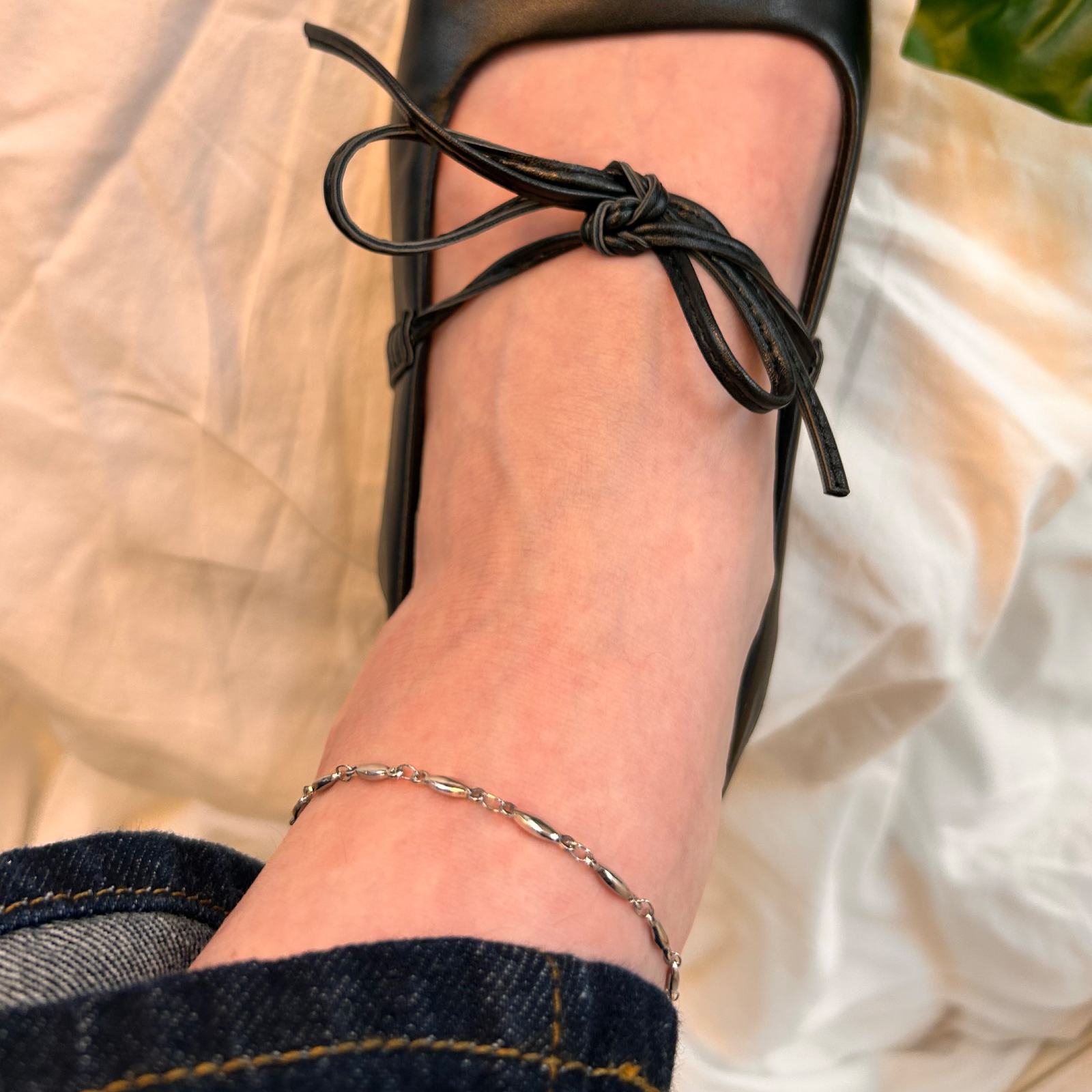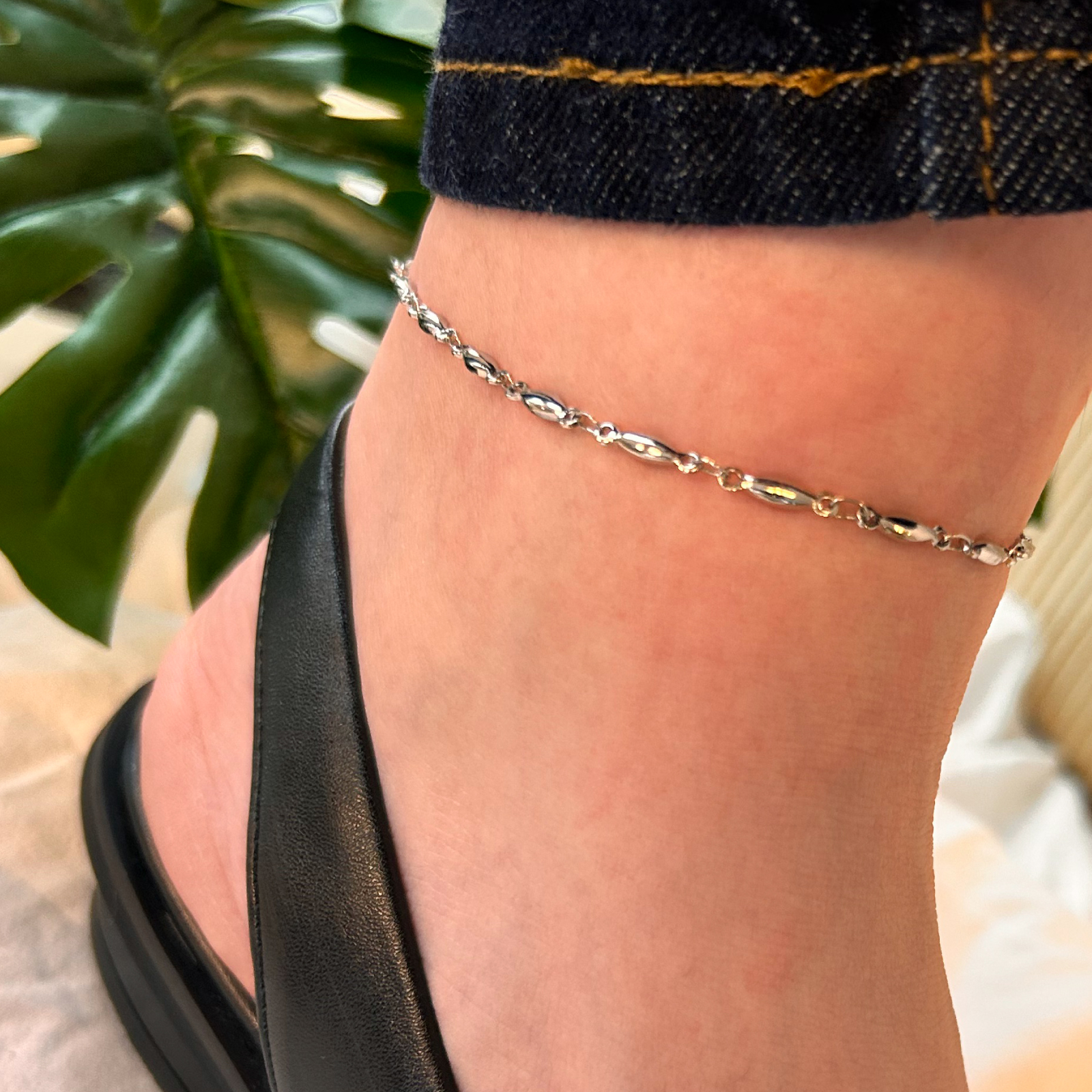 モダンでミニマルな印象を与えるステンレス製アンクレット。2.5mm幅の手作りチェーンが足元にさりげない存在感を添えます。程よい光沢が魅力でカジュアルにもフェミニンにもマッチするデザインです。