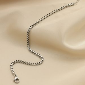 立体感あるスクエアボックスチェーンが足元に洗練された印象を与える一品。2.5mm幅の程よい太さでシンプルながらも高級感のある仕上がり。動くたびにさりげなく輝き日常の装いに上質なアクセントを加えます。