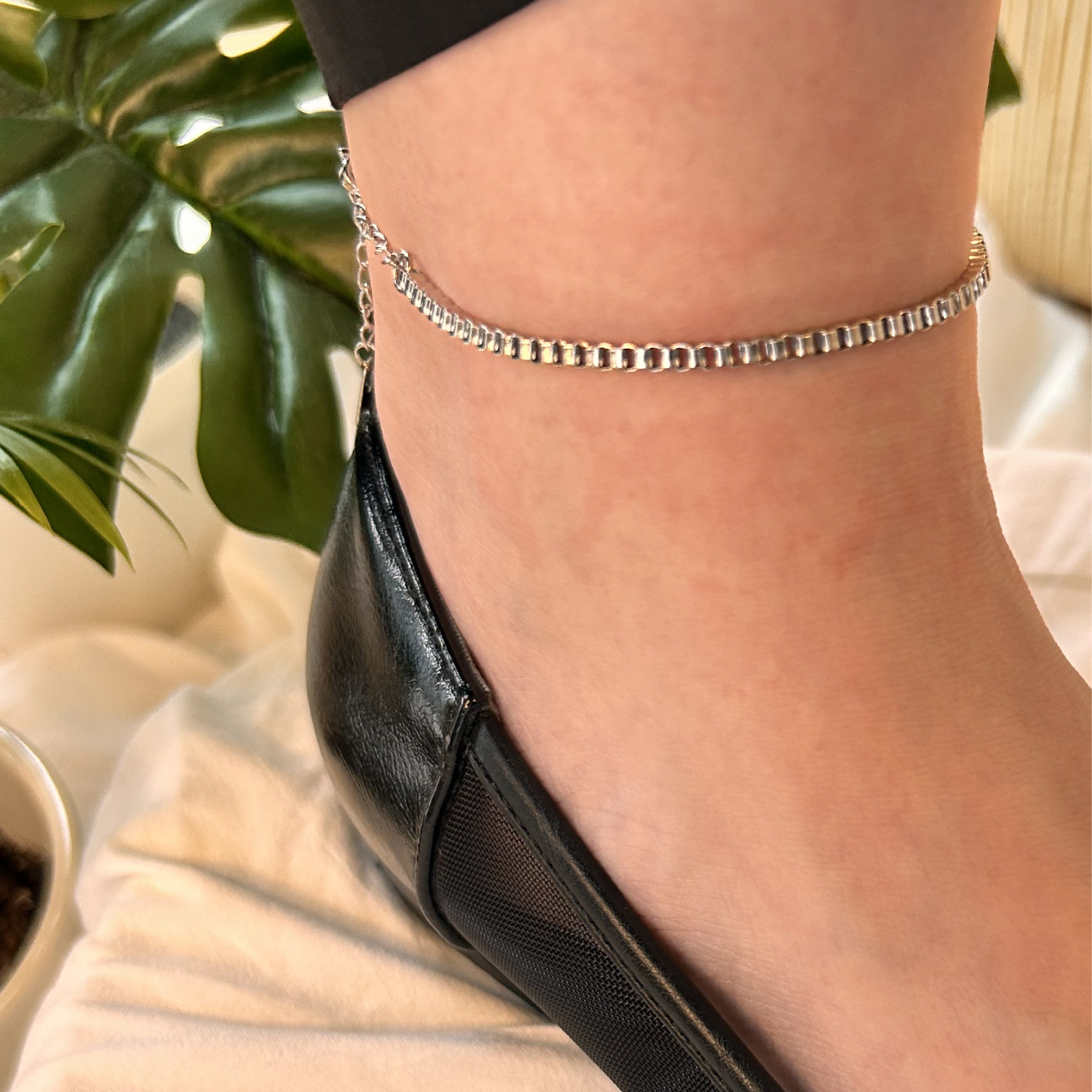 立体感あるスクエアボックスチェーンが足元に洗練された印象を与える一品。2.5mm幅の程よい太さでシンプルながらも高級感のある仕上がり。動くたびにさりげなく輝き日常の装いに上質なアクセントを加えます。