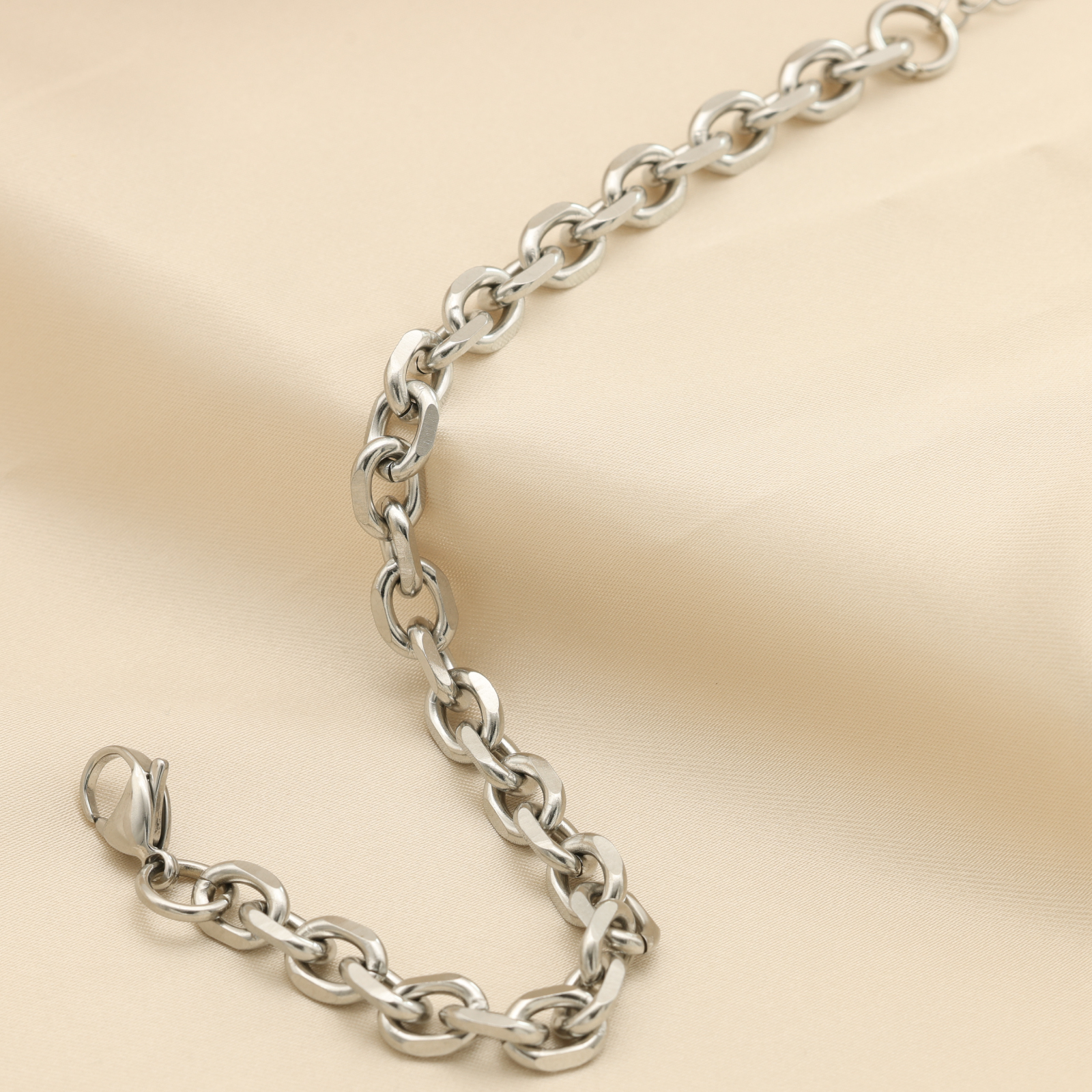 伝統的な喜平チェーンの力強いフォルムが足元に圧倒的な存在感をもたらします。7.2mm幅のしっかりとしたコマが動くたびにキラリと輝きコーディネートの主役にもなるアンクレットです。多面カット風のエッジが光を反射し高級感を演出します。