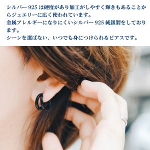 素材は高品質なシルバー925を採用。低刺激性で金属アレルギーにも配慮されておりファーストピアスとしても安心して着用できます。中折れ式のフープピアスでワンタッチ装着が可能。ポス先端は丸く処理されホールにも優しい設計です。