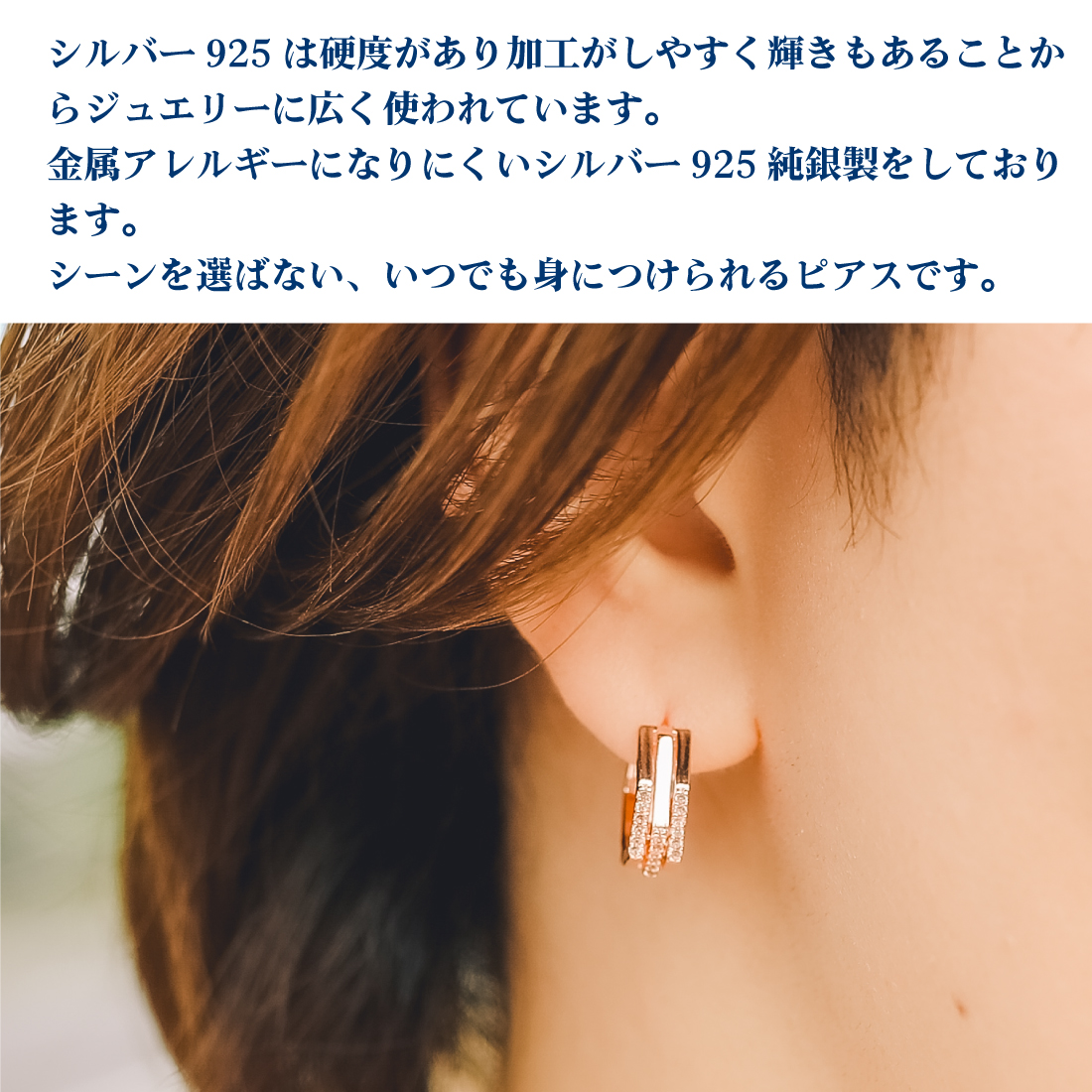 リング素材はアレルギーになりにくいシルバー925を採用しております。シルバー925とは92.5%が銀、残りの7.5%が銅などの合金でできた銀製品のことです。純銀に比べて硬度が高く強度があり変色しにくいためジュエリーやアクセサリーなどに広く使用されています。シルバー925のピアスは、銀の光沢感とシンプルなデザインが魅力で耳元を上品に演出してくれます。