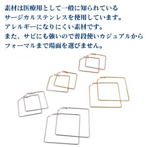 ステンレスフープピアスは、ステンレス素材を使用したアクセサリーで、軽量で丈夫なのが特徴です。また、アレルギーを引き起こしにくい素材ですのでデリケートな肌質の方にもおすすめです。ステンレスとは「Stainless Steel」ステンレス鋼の略です。Stain(錆び・汚れ)+less(少ない)=Stainless(錆びない・汚れない)、Steel(鋼)という意味があります。傷がつきにくくサビにくいので汗や皮脂などで汚れても酸化しないためアレルギーの原因となる金属が溶け出さず肌荒れがおきにくくなっております。ただすべての方にアレルギーフリーというわけではありません。装着後は、付属のジュエリークロスで汚れをふき取ってください。また、長い間使用しない場合は、付属のジュエリーポーチで保管してください。ちょっとしたひと手間で輝きを失わず長くピアスをご利用いただけます。
