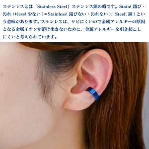 ステンレスイヤーカフは医療用として一般に知られているサージカルステンレスを使用しております。アレルギーを引き起こしにくい素材ですのでデリケートな肌質の方にもおすすめです。傷がつきにくくサビにくいので汗や皮脂などで汚れても酸化しないためアレルギーの原因となる金属が溶け出さず肌荒れがおきにくくなっております。