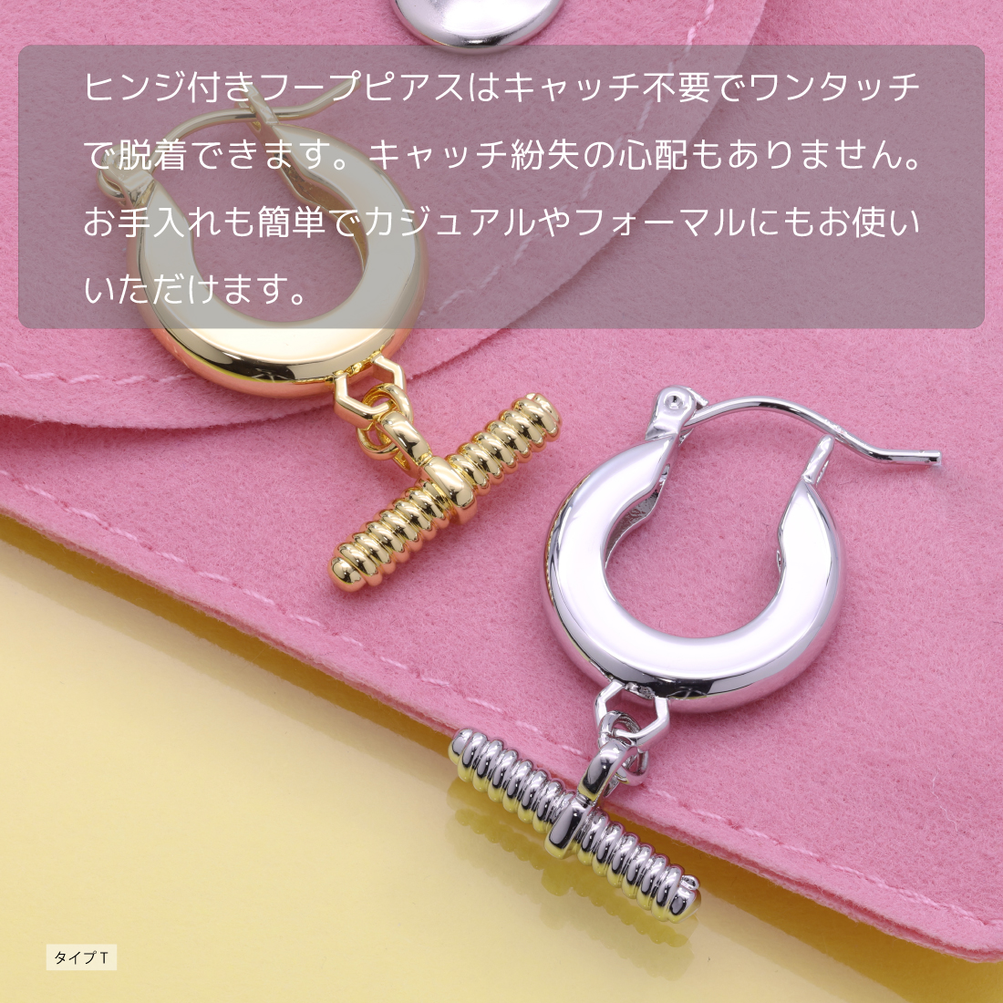 ヒンジ付きフープピアスはキャッチ不要でワンタッチで脱着できます。