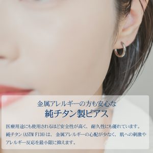 医療用グレード(ASTM F136)の純チタンを採用し、金属アレルギーを起こしにくい低刺激性素材を使用しています。純チタンフープピアスは、サビに強く汗や水に触れても変色しにくいため、スポーツや入浴時にも安心して着用可能。特に肌が敏感な方やアレルギーが心配な方に最適な選択肢となります。耐久性に優れ変形しにくいため、長期間美しい状態を維持できます。 水に濡れた際は柔らかい布で軽く拭くだけで簡単にケアできるので忙しい方にもおすすめです。