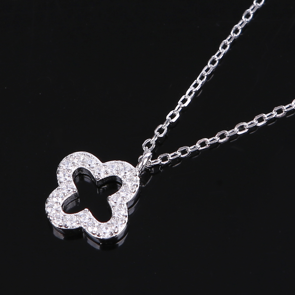 エレガントで華奢なデザインが魅力の四つ葉のクローバーネックレス。クローバーモチーフは古くから幸運の象徴として親しまれ大切な人への贈り物やお守りとしても人気があります。キュービックジルコニアを贅沢に散りばめたペンダントが光を美しく反射しどんな角度からも洗練された輝きを放ちます。シンプルでありながら華やかさも兼ね備えたシルバーネックレスは普段使いから特別な日まで幅広く活躍します。