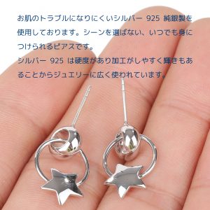 ポスト素材はアレルギーになりにくいシルバー925を採用しております。シルバー925とは92.5%が銀、残りの7.5%が銅などの合金でできた銀製品のことです。純銀に比べて硬度が高く強度があり変色しにくいためジュエリーやアクセサリーなどに広く使用されています。シルバー925のピアスは銀の光沢感とシンプルなデザインが魅力で耳元を上品に演出してくれます。