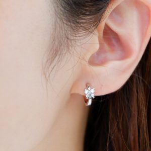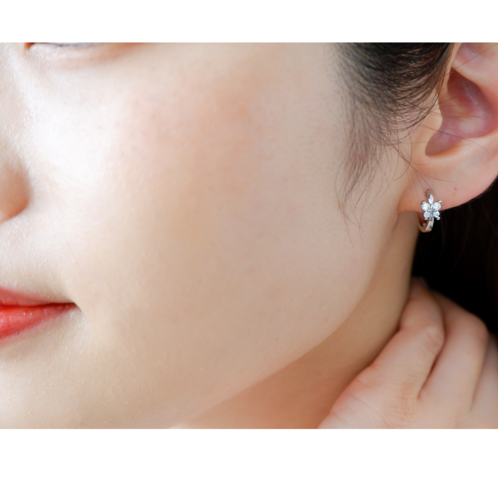 蝶の羽根に見立てた部分には高輝度ランクの高品質キュービックジルコニアを使用。屈折率が高く光を受けるたびにダイヤモンドのような輝きを放ちます。シンプルながらも印象的なデザインのフープピアスはあらゆるコーディネートに華を添えてくれます。