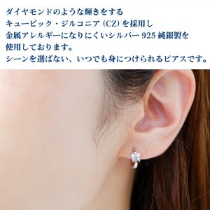 本体には高品質なシルバー925を使用。92.5%の純銀に合金を加えたこの素材は強度と輝きを兼ね備えており変色しにくく長持ちします。金属アレルギーを起こしにくい特性もあり、敏感肌の方にも安心してお使いいただけるシルバーピアスです。