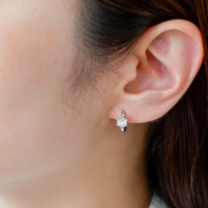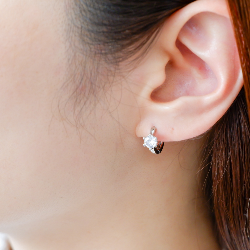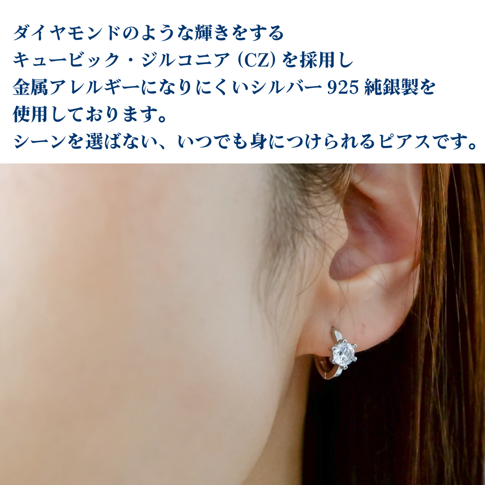 センターに配置された高輝度キュービックジルコニアはダイヤモンドのように高い屈折率を持ち角度によって光を美しく反射します。ラウンドブリリアントカットが光を最大限に引き出しシンプルながらも華やかな印象に。リングピアスの立体的な爪留めが石の透明感と煌めきを引き立てシルバーピアスとしての魅力をより一層高めています。