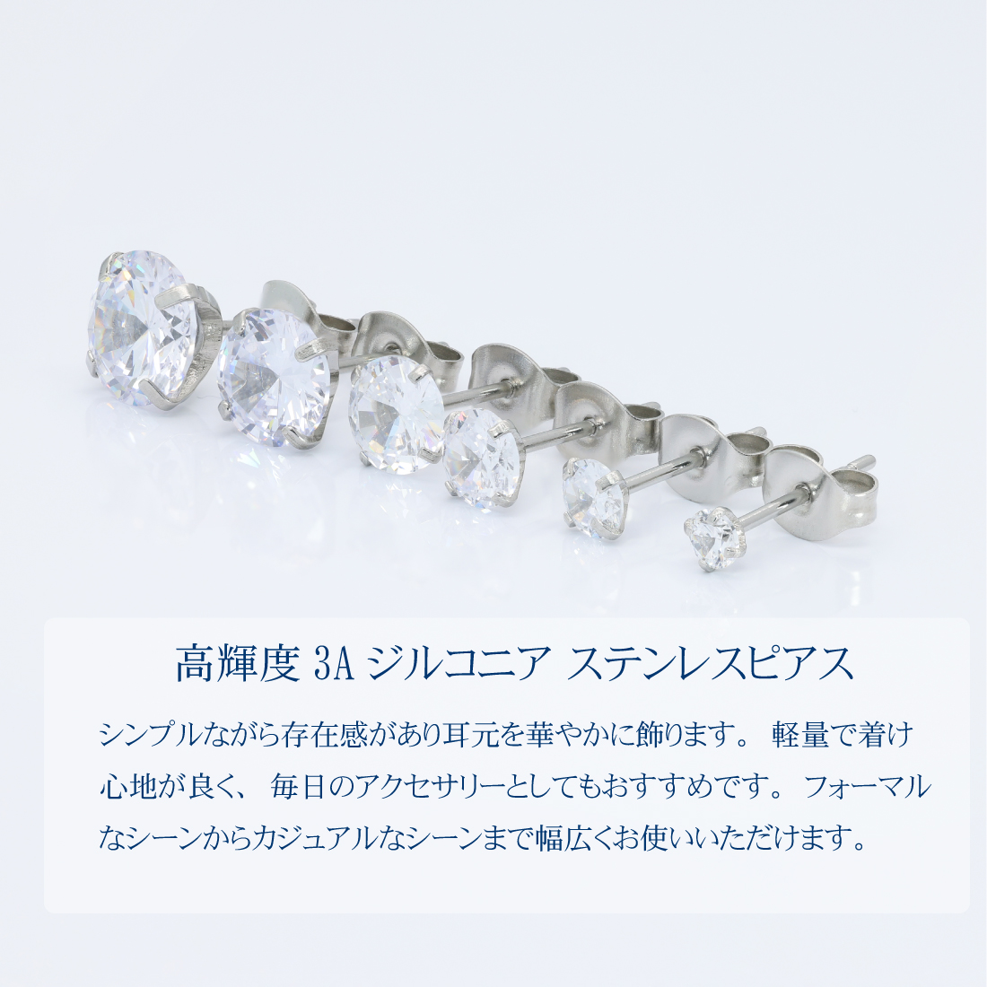 高輝度3Aジルコニアを使用した上品でエレガントな1粒スタッドピアスです。シンプルながら存在感があり耳元を華やかに飾ります。軽量で着け心地が良く、毎日のアクセサリーとしてもおすすめです。フォーマルなシーンからカジュアルなシーンまで幅広くお使いいただけます。種類は6サイズ3カラーご用意しております。様々なシチュエーションやレディースピアス、メンズピアスとしてご利用できる高級感ある定番ジュエリーです。