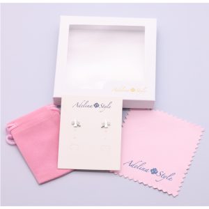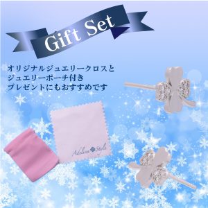 シルバー製品は汚れを放置すると酸化して黒ずんでしまうため、装着後付属のジュエリークロスで汚れをふき取ってください。また、長い間使用しない場合は付属のジュエリーポーチで保管してください。ちょっとしたひと手間で輝きを失わず長くピアスをご利用いただけます。