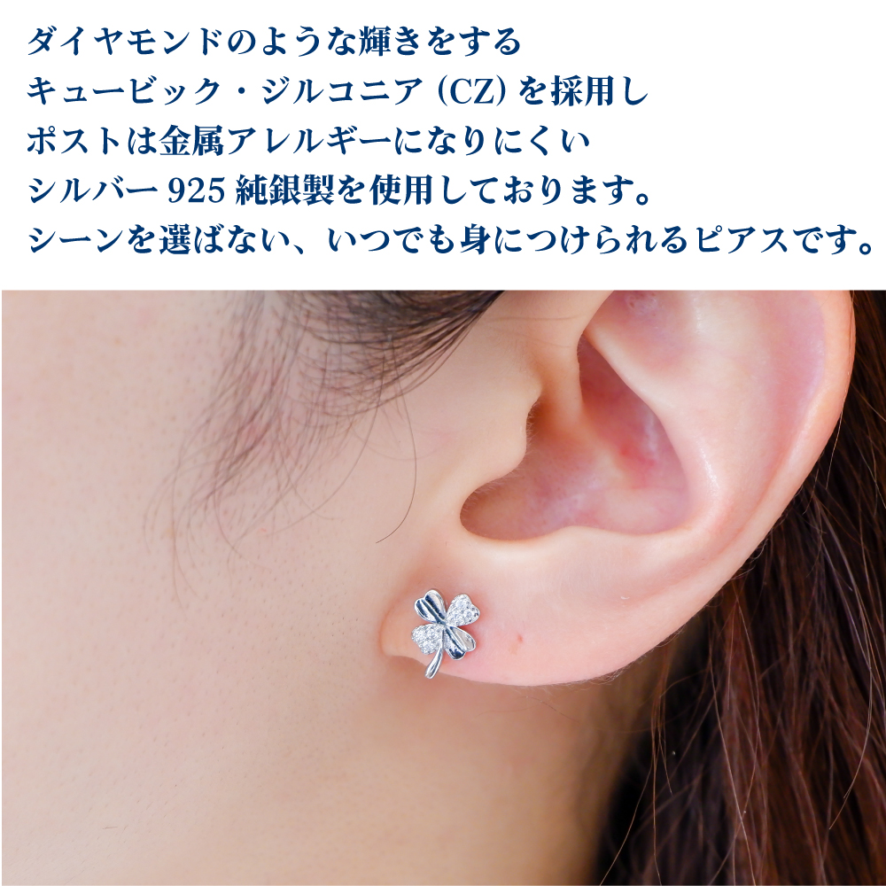 細部までこだわったよつ葉に高輝度ジルコニアを葉に3個3個配したデザインは美しい仕上がりになっています。ピアス本体には925スターリングシルバーを使用しており、高級感あるデザインとなっています。日常使いから特別なシーンまで幅広く使えるアクセサリーです。