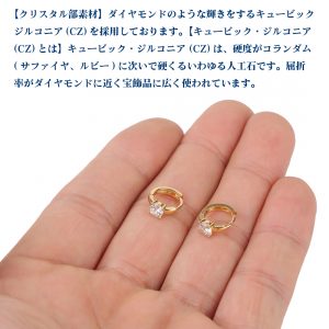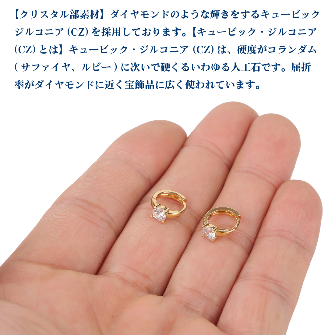 18金の美しい輝きを放つ金メッキにジルコニアをあしらわれたフープピアスです。シンプルなデザインでありながら大粒のジルコニアが輝くことで華やかさを演出してくれます。レディースピアスとして普段使いはもちろんフォーマルな場にも合わせやすく幅広いシーンで活躍してくれます。アレルギーの原因となるニッケルを含まない加工をしております。