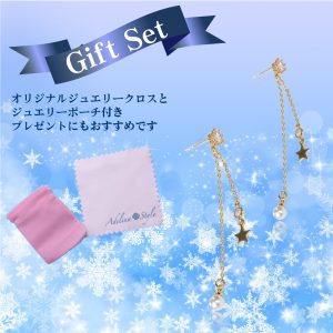 シルバー製品は汚れを放置すると酸化して黒ずんでしまうため、装着後付属のジュエリークロスで汚れをふき取ってください。また、長い間使用しない場合は付属のジュエリーポーチで保管してください。ちょっとしたひと手間で輝きを失わず長くピアスをご利用いただけます。
