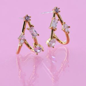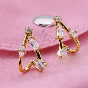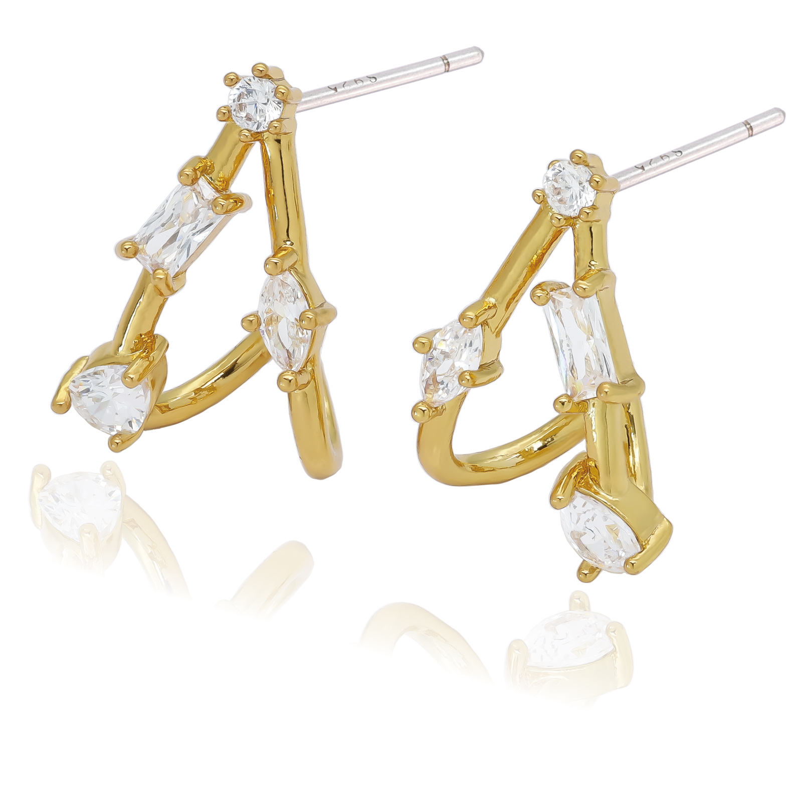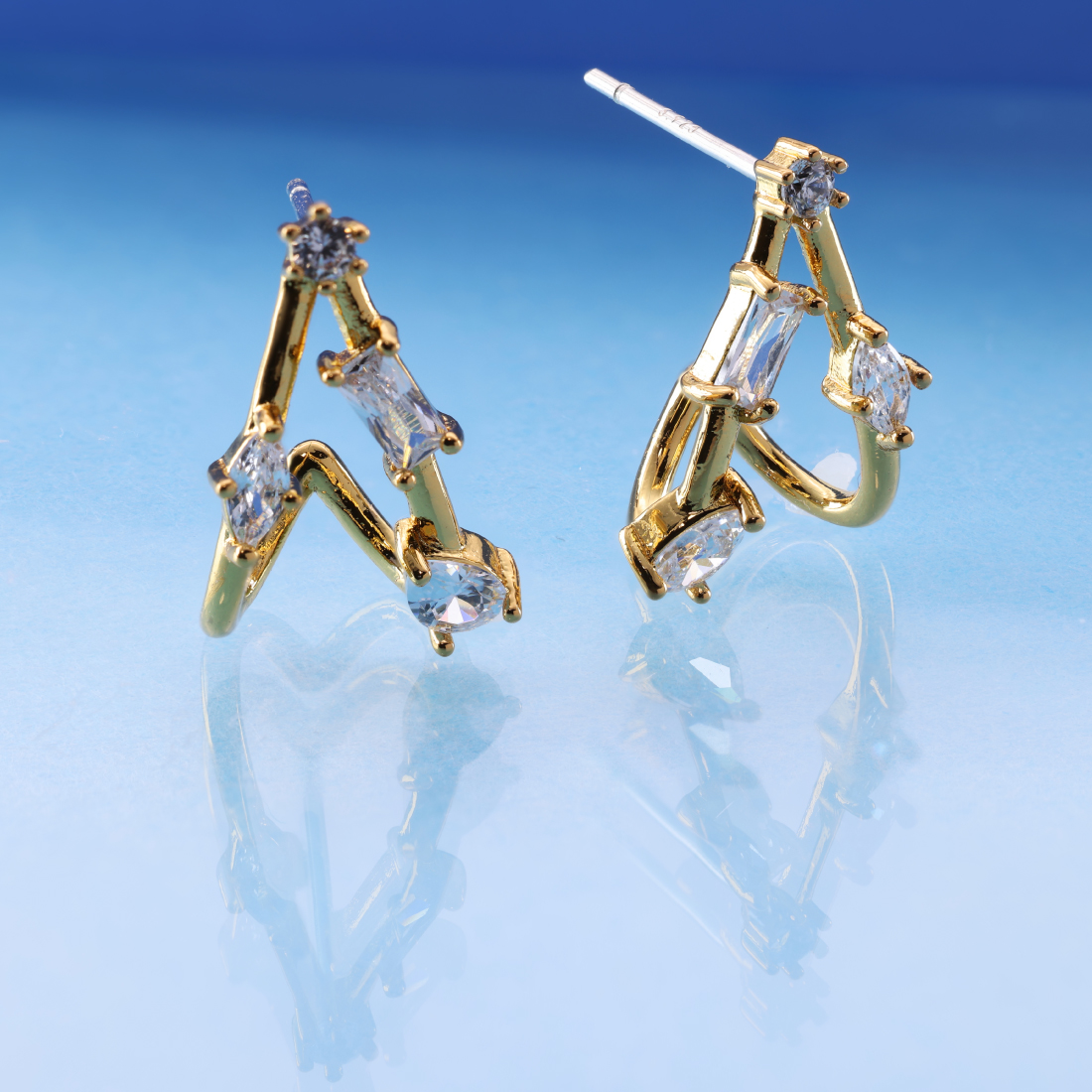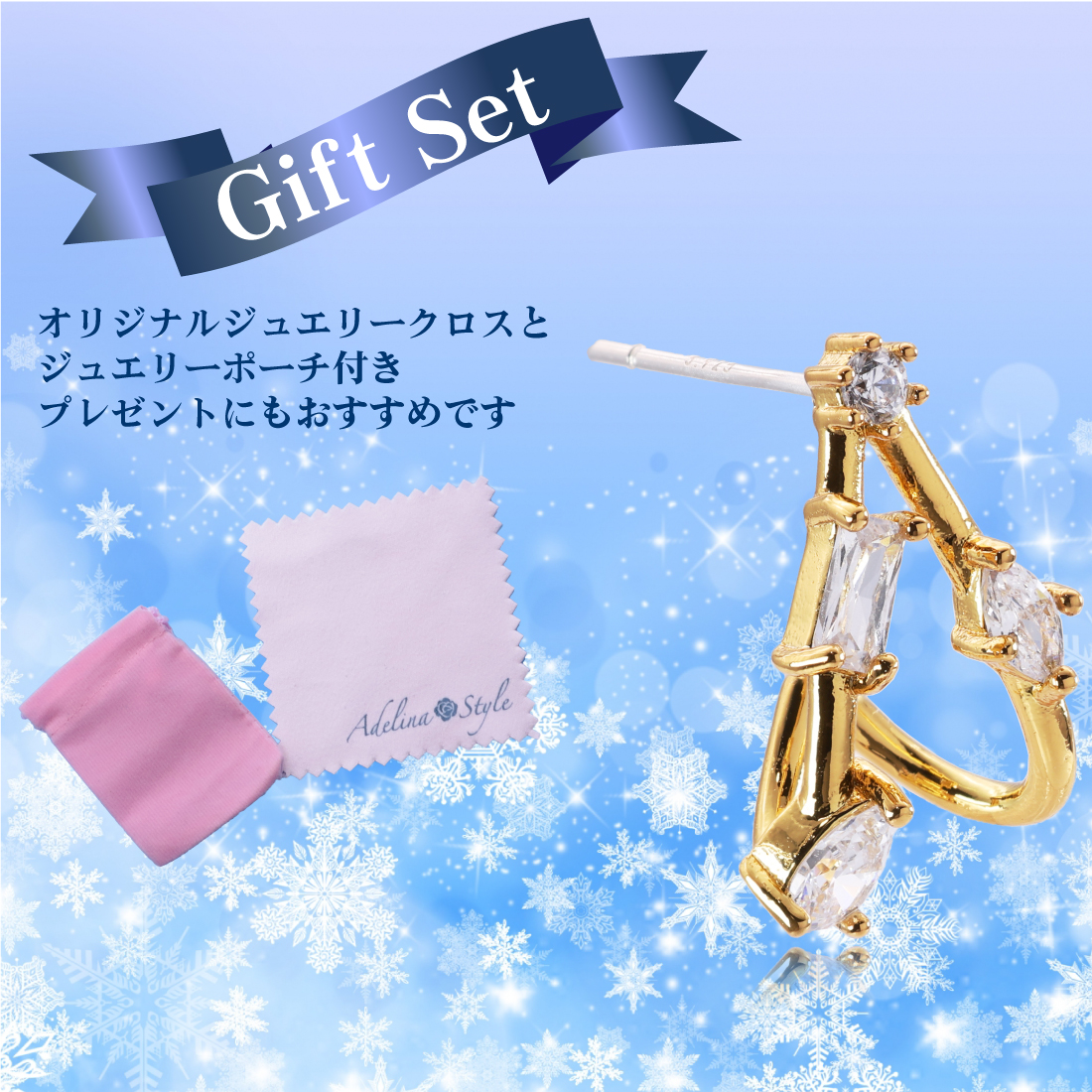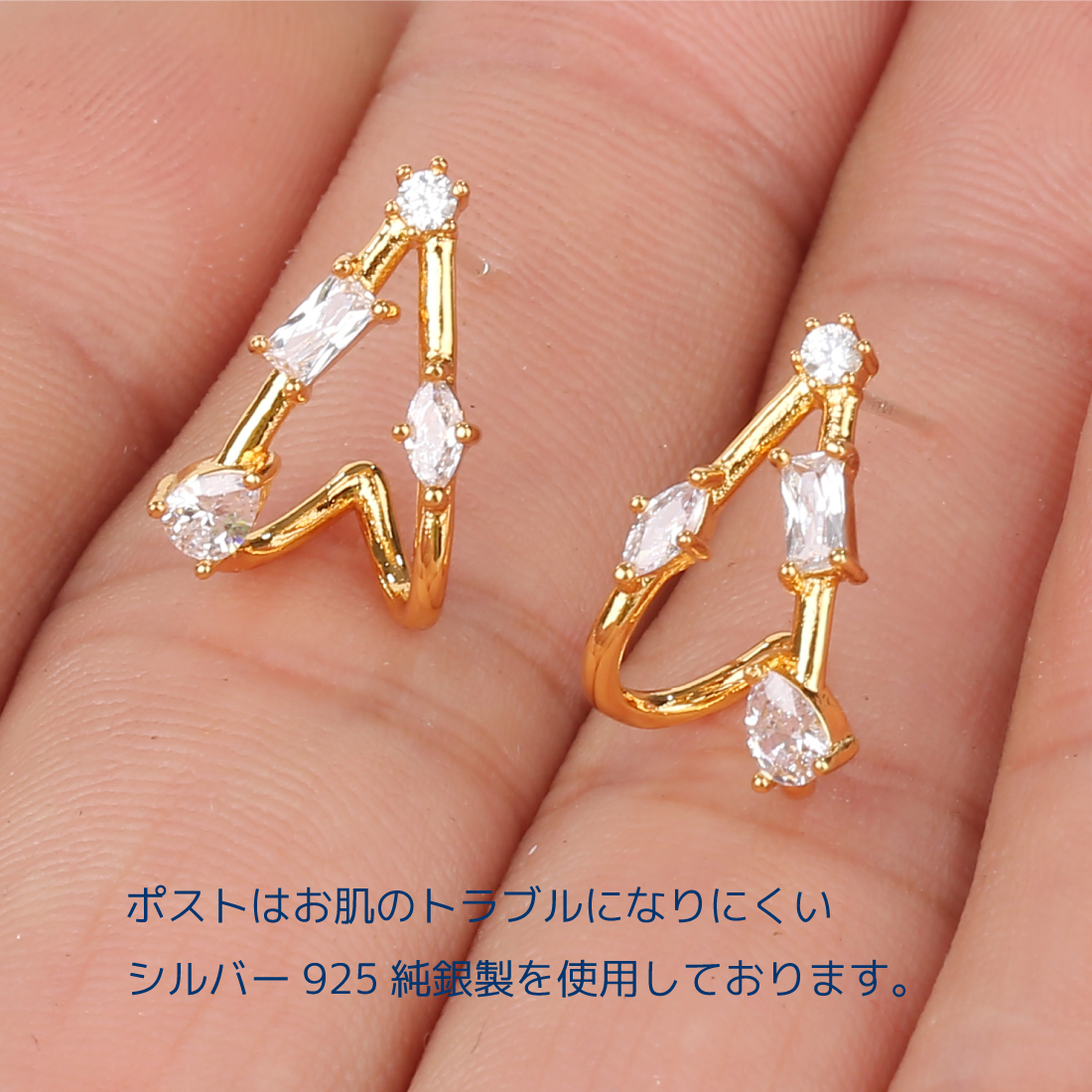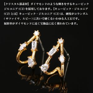 大小4個のジルコニアを使ったデザインで輝きが美しく存在感があります。高級感あふれる輝きを楽しむことができるため、贈り物にもおすすめです。ボディーは美し光沢の金メッキでポストはスターリングシルバーを採用し耳に優しい素材となっています。