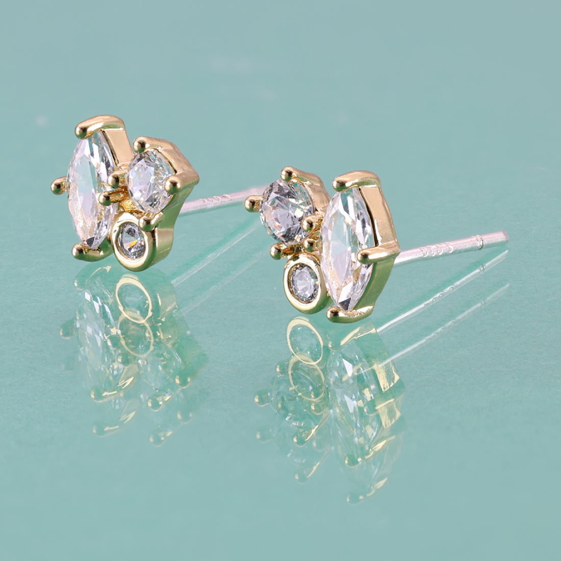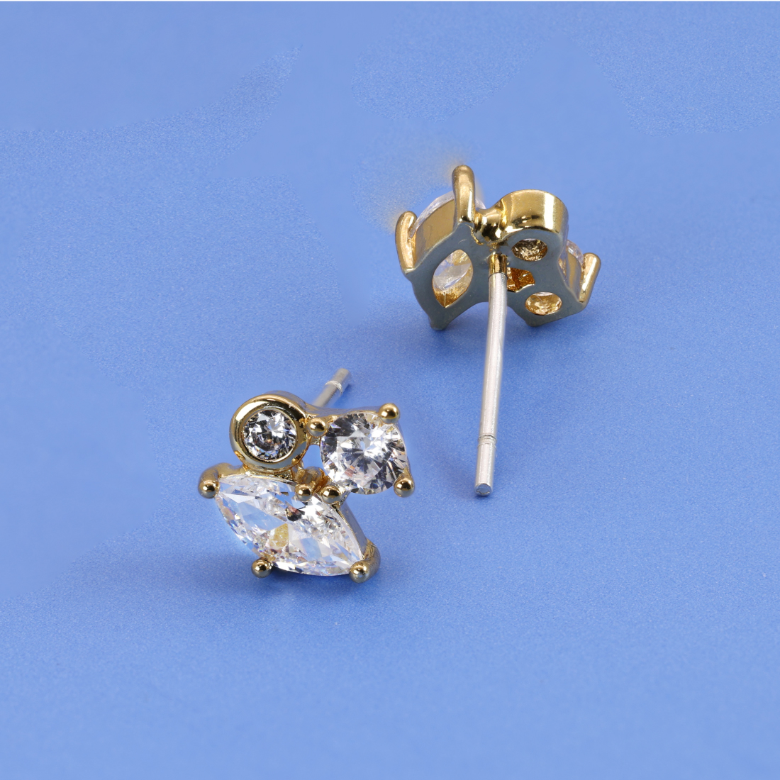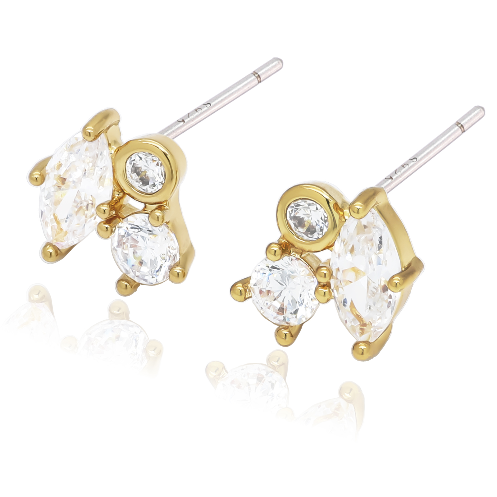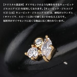 大小3個のジルコニアを使ったデザインで輝きが美しく存在感があります。高級感あふれる輝きを楽しむことができるため、贈り物にもおすすめです。ボディーは美し光沢の金メッキでポストはスターリングシルバーを採用し耳に優しい素材となっています。