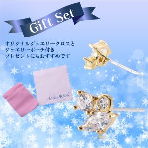 シルバー製品は汚れを放置すると酸化して黒ずんでしまうため、装着後付属のジュエリークロスで汚れをふき取ってください。また、長い間使用しない場合は付属のジュエリーポーチで保管してください。ちょっとしたひと手間で輝きを失わず長くピアスをご利用いただけます。