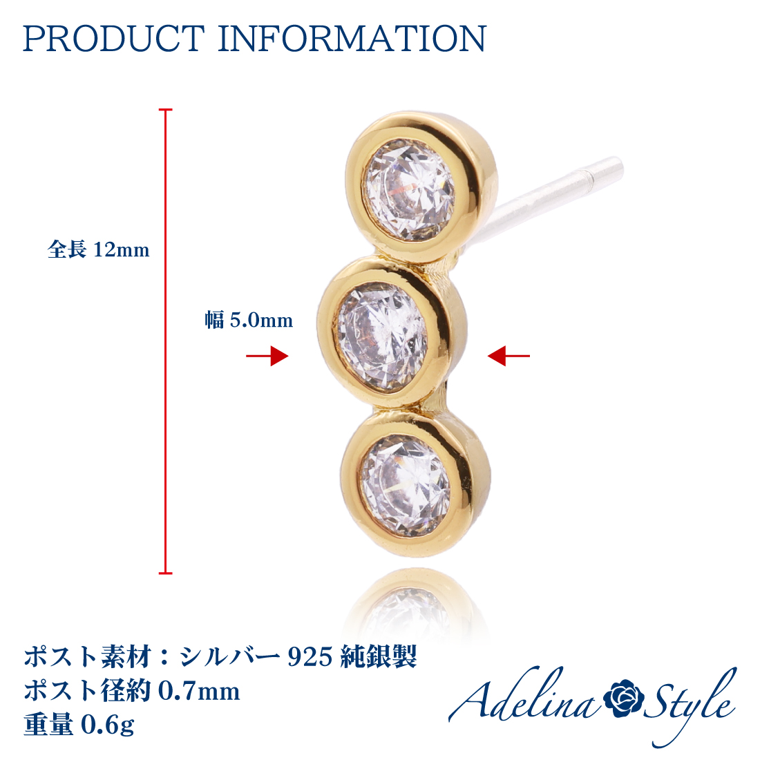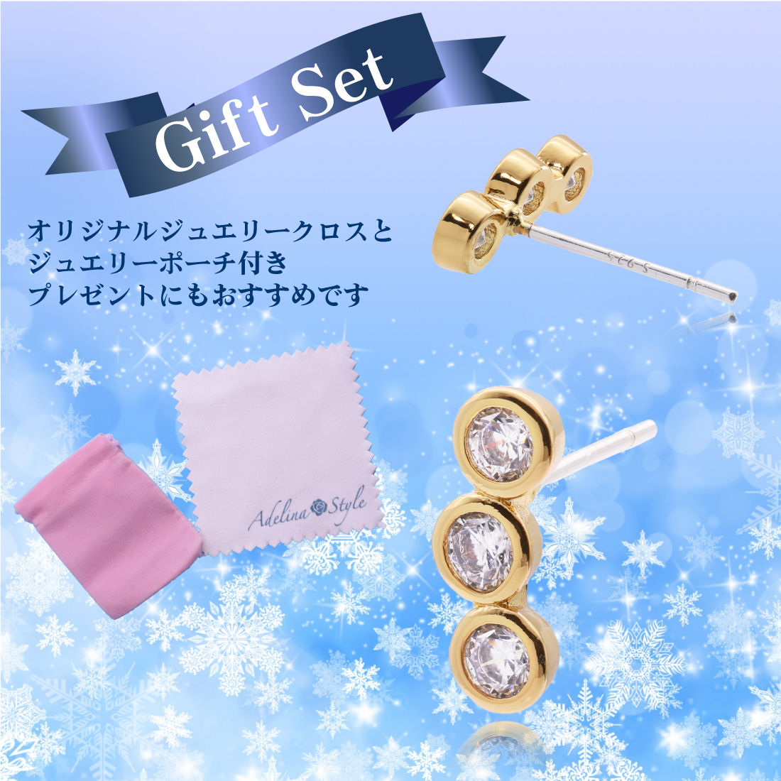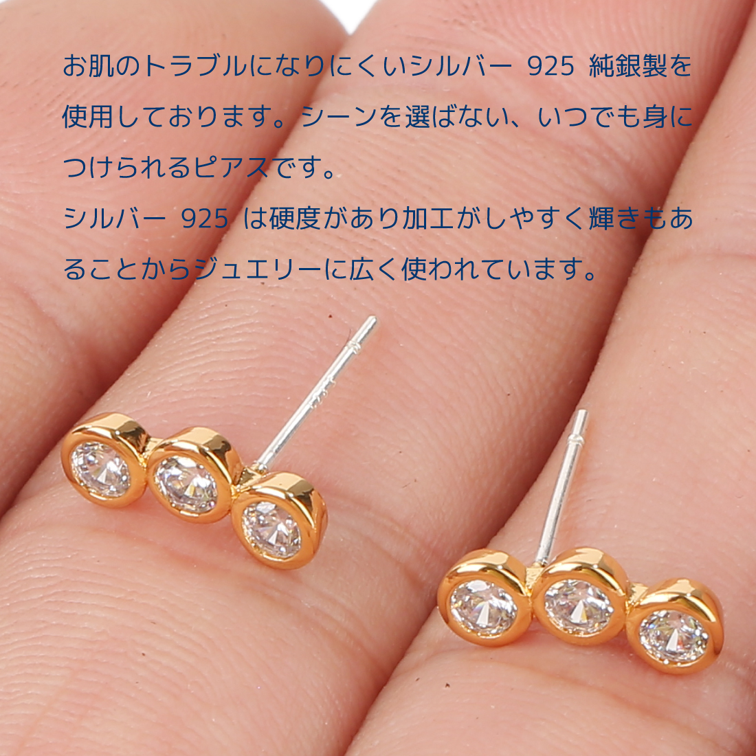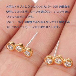 左右3個づつ配したジルコニアの輝きが美しく存在感があります。高級感あふれる輝きを楽しむことができるため、贈り物にもおすすめです。ボディーは美し光沢の金メッキでポストはスターリングシルバーを採用し耳に優しい素材となっています。