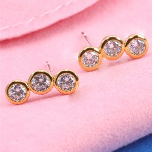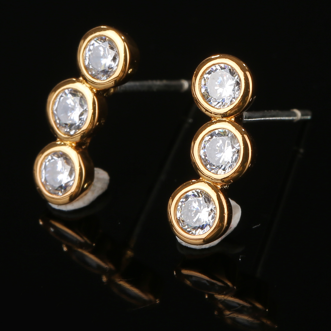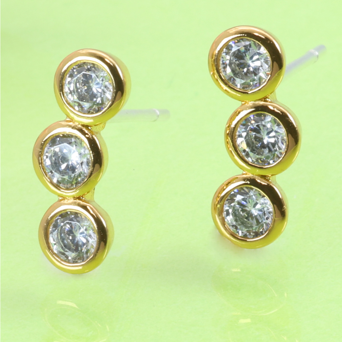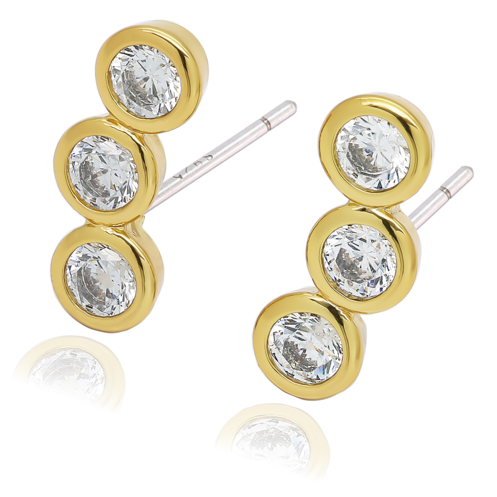 左右3個づつ配したジルコニアの輝きが美しく存在感があります。高級感あふれる輝きを楽しむことができるため、贈り物にもおすすめです。ボディーは美し光沢の金メッキでポストはスターリングシルバーを採用し耳に優しい素材となっています。