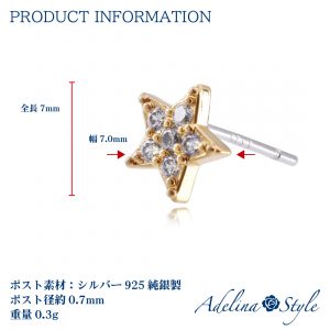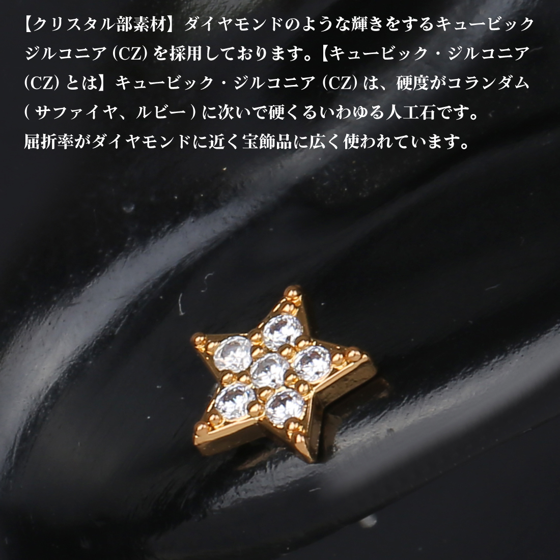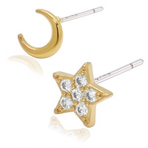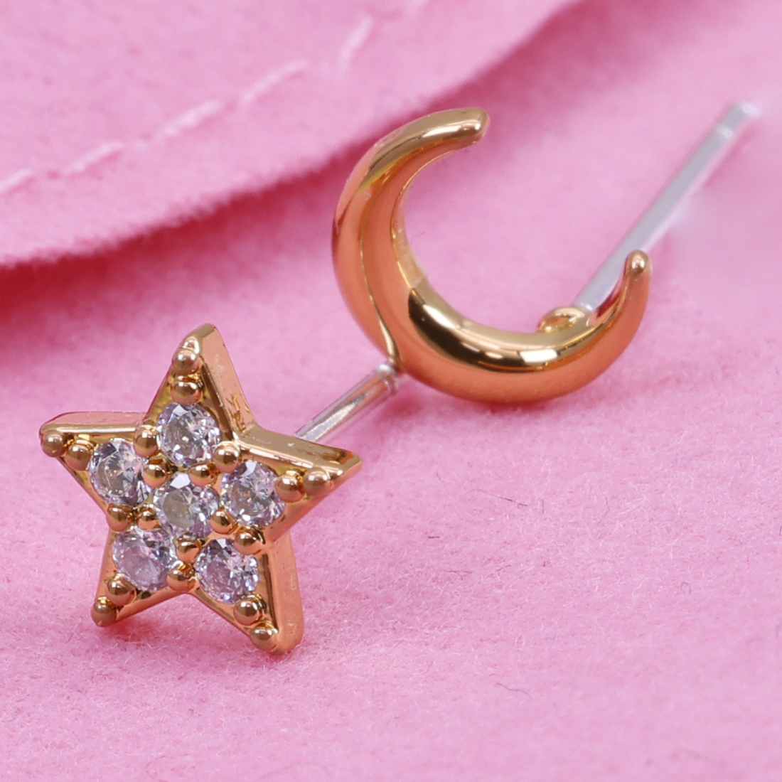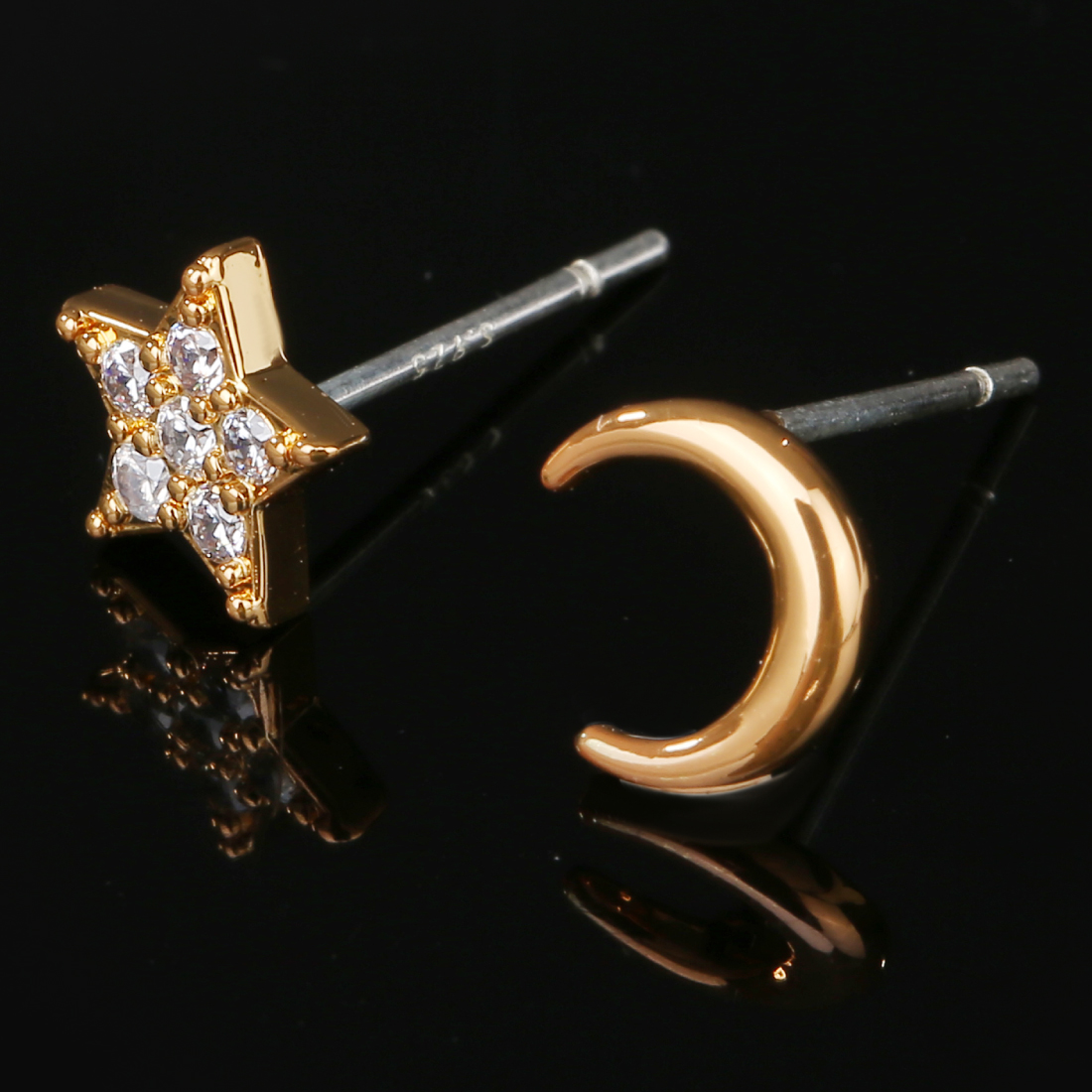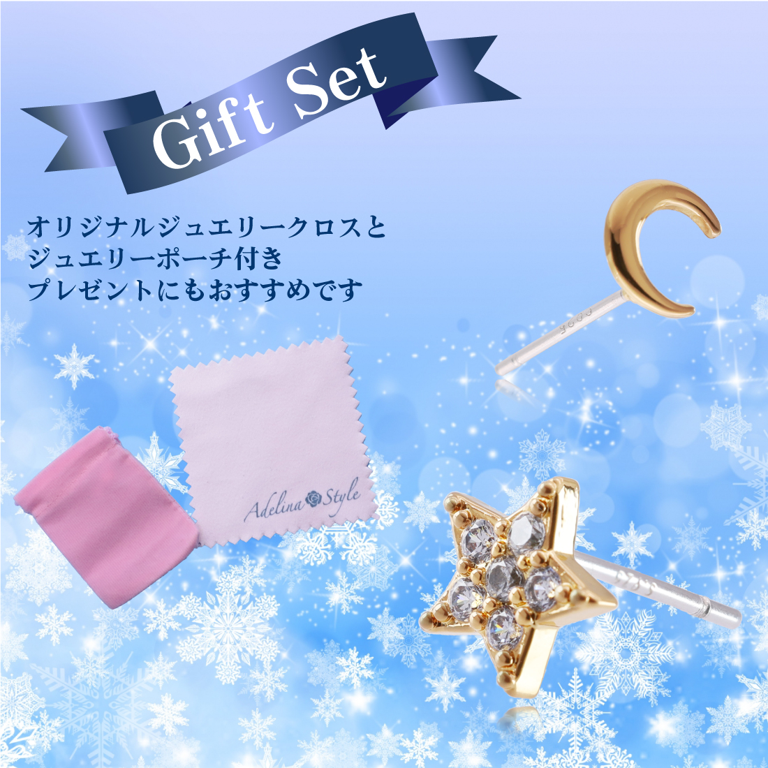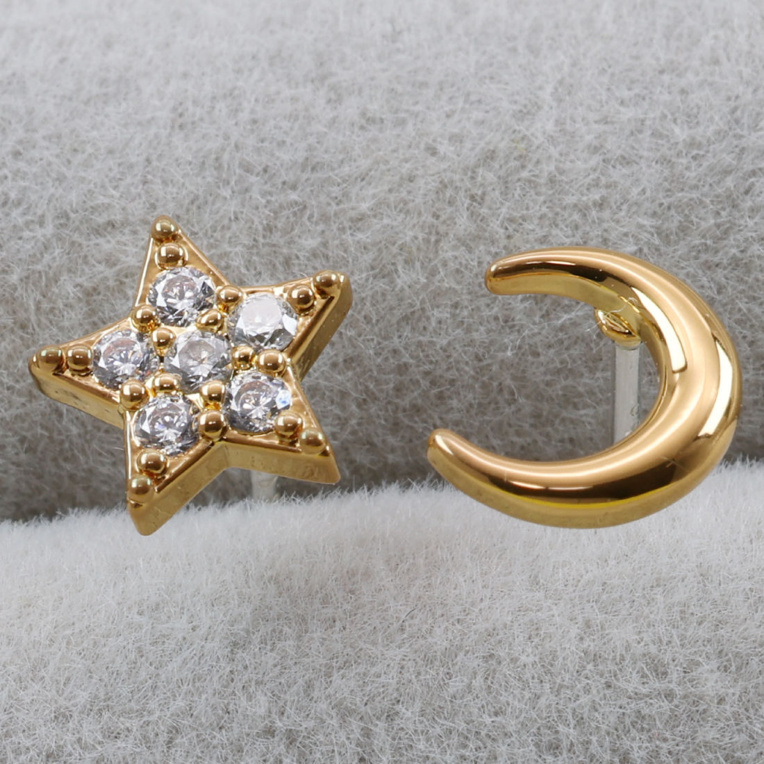 左右異なるデザインで星側に5個のジルコニアが美しく輝き存在感があります。高級感あふれる輝きを楽しむことができるため、贈り物にもおすすめです。ボディーは美し光沢の金メッキでポストはスターリングシルバーを採用し耳に優しい素材となっています。