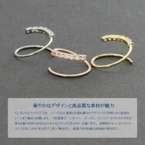 ゴールド、シルバー、ピンクゴールドの3色展開。どのカラーも肌なじみが良くシーンや気分に合わせてコーディネートを楽しめます。シルバーはクールで知的な印象ピンクゴールドは華やかでフェミニンな印象ゴールドはリッチで存在感のあるスタイルにおすすめです。