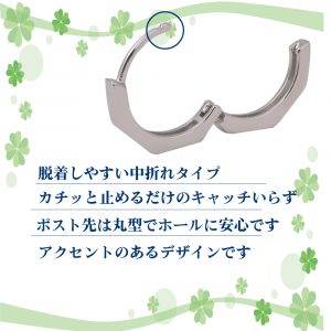 脱着しやすい中折れタイプです。カチッと止めるだけ、キャッチ不要タイプなのでなくすこともありません。【フープピアス装着方法】ピアスを装着するには、ポストを軽く内側に押しながらはめてください。ポストが外に出ないためマスクをしていても引っかかりにくく安心してご利用いただけます。