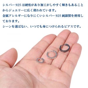 リング素材はアレルギーになりにくいシルバー925を採用しております。シルバー925とは92.5%が銀、残りの7.5%が銅などの合金でできた銀製品のことです。純銀に比べて硬度が高く強度があり変色しにくいためジュエリーやアクセサリーなどに広く使用されています。シルバー925のピアスは、銀の光沢感とシンプルなデザインが魅力で耳元を上品に演出してくれます。