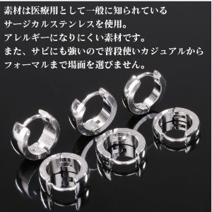 ステンレスフープピアスは医療用として一般に知られているサージカルステンレスを使用しております。アレルギーを引き起こしにくい素材ですのでデリケートな肌質の方にもおすすめです。傷がつきにくくサビにくいので汗や皮脂などで汚れても酸化しないためアレルギーの原因となる金属が溶け出さず肌荒れがおきにくくなっております。