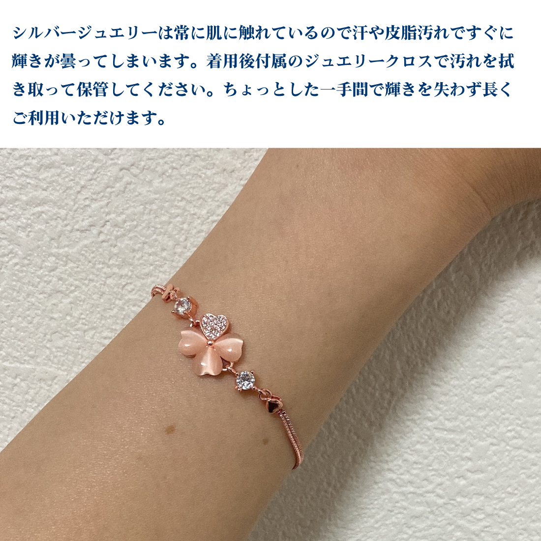 エレガントなデザインと華奢な輝きが魅力のエレガント アクセサリー。繊細なクローバーモチーフとキュービックジルコニアの煌めきが手元を美しく演出します。レディース ブレスレットとして女性らしさを引き立てる上品なデザイン。特別な日のアクセントにも普段の装いに華やかさをプラスするおしゃれ ブレスレットとしても最適です。