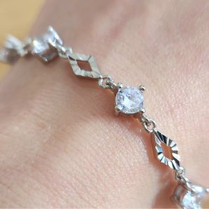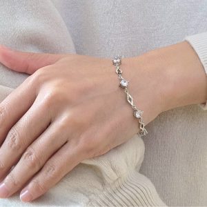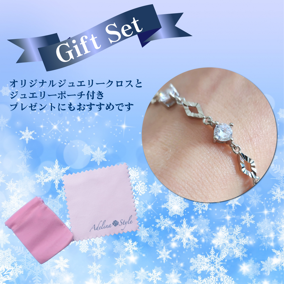 このブレスレットには、**キュービックジルコニア(CZ)**を使用。ダイヤモンドに匹敵する輝きを持ち光を美しく反射するため手元を明るく演出します。カットの美しさと高い透明度によりシンプルなデザインながらも存在感のある仕上がりになっています。