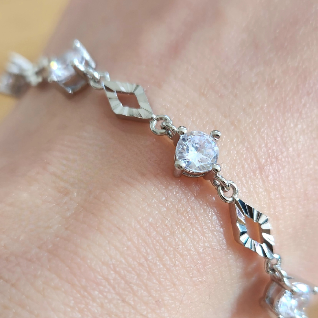 この華奢 ブレスレットはスタイリッシュな幾何学モチーフが特徴。ダイヤ型のメタルパーツとキュービックジルコニアの組み合わせが洗練された印象を与えます。シンプルなデザインながらも個性的な輝きを放ちカジュアルからフォーマルまで幅広いコーディネートにマッチします。