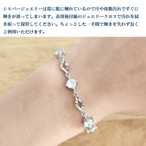 このブレスレットは合金にシルバーメッキを施した仕様。合金の軽やかさと耐久性にシルバーの美しい光沢を加え華やかで洗練された仕上がりに。軽いつけ心地で長時間の着用でもストレスなく楽しめます。