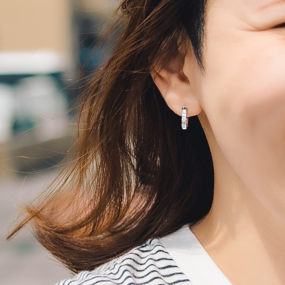 耳元に洗練された印象を添えるシルバー925製の小さめリングピアス。幅2.6mm・内径7×8mmのコンパクトなサイズ感ながら高輝度キュービックジルコニアの輝きが美しく並び存在感のあるデザインに仕上がっています。メンズ・レディース問わず使える上品でスマートなシルエットは日常にもフォーマルな場にもぴったりです。