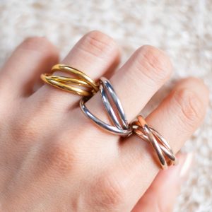 エレガントなデザインが特徴の3連リングです。3本のリングが絡み合う独自のフォルムはシンプルながらも印象的な存在感を放ちます。高品質なステンレス素材を使用しており、錆びにくく耐久性に優れているため日常使いにも最適です。重ね着けのような立体感が楽しめ1つで指先を華やかに演出します。
