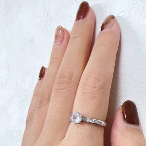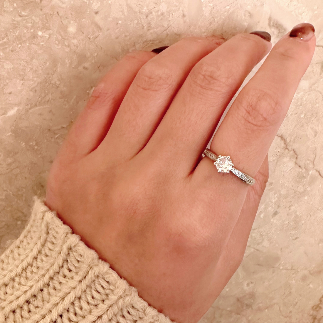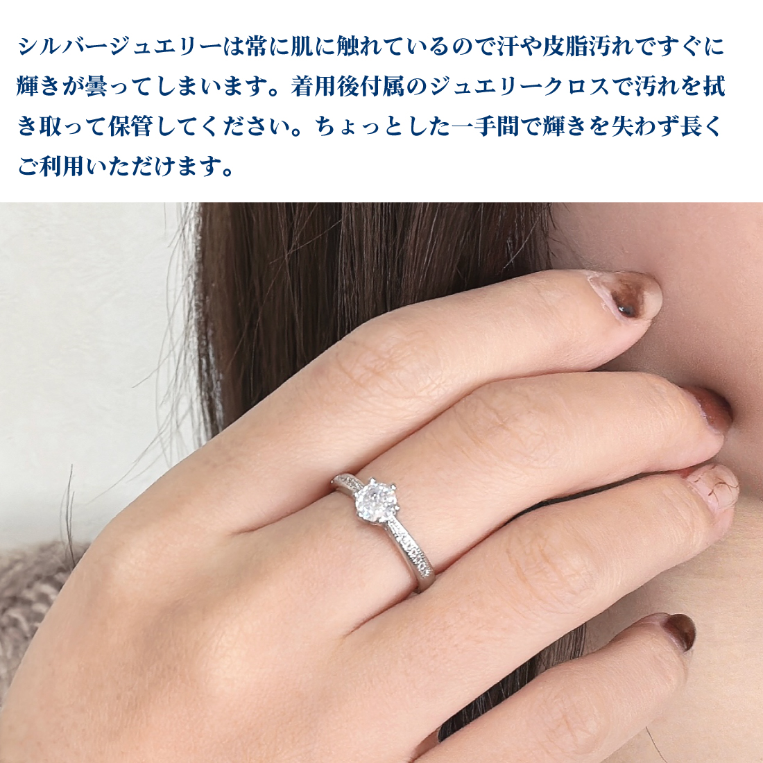 シルバーリングに6爪でセットされたジルコニアシルバーリングはエレガントで上品な印象です。高品質なシルバーを使用している為アレルギーの心配も少ない仕様となっております。サイズ調整可能で着け心地もよく長時間着用していても疲れにくいのも特徴です。大人女子のおしゃれなアクセントとしてご利用いただけます。