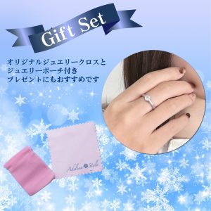 シルバー製品は汚れを放置すると酸化して黒ずんでしまうため、装着後付属のジュエリークロスで汚れをふき取ってください。また、長い間使用しない場合は付属のジュエリーポーチで保管してください。ちょっとしたひと手間で輝きを失わず長くリングをご利用いただけます。
