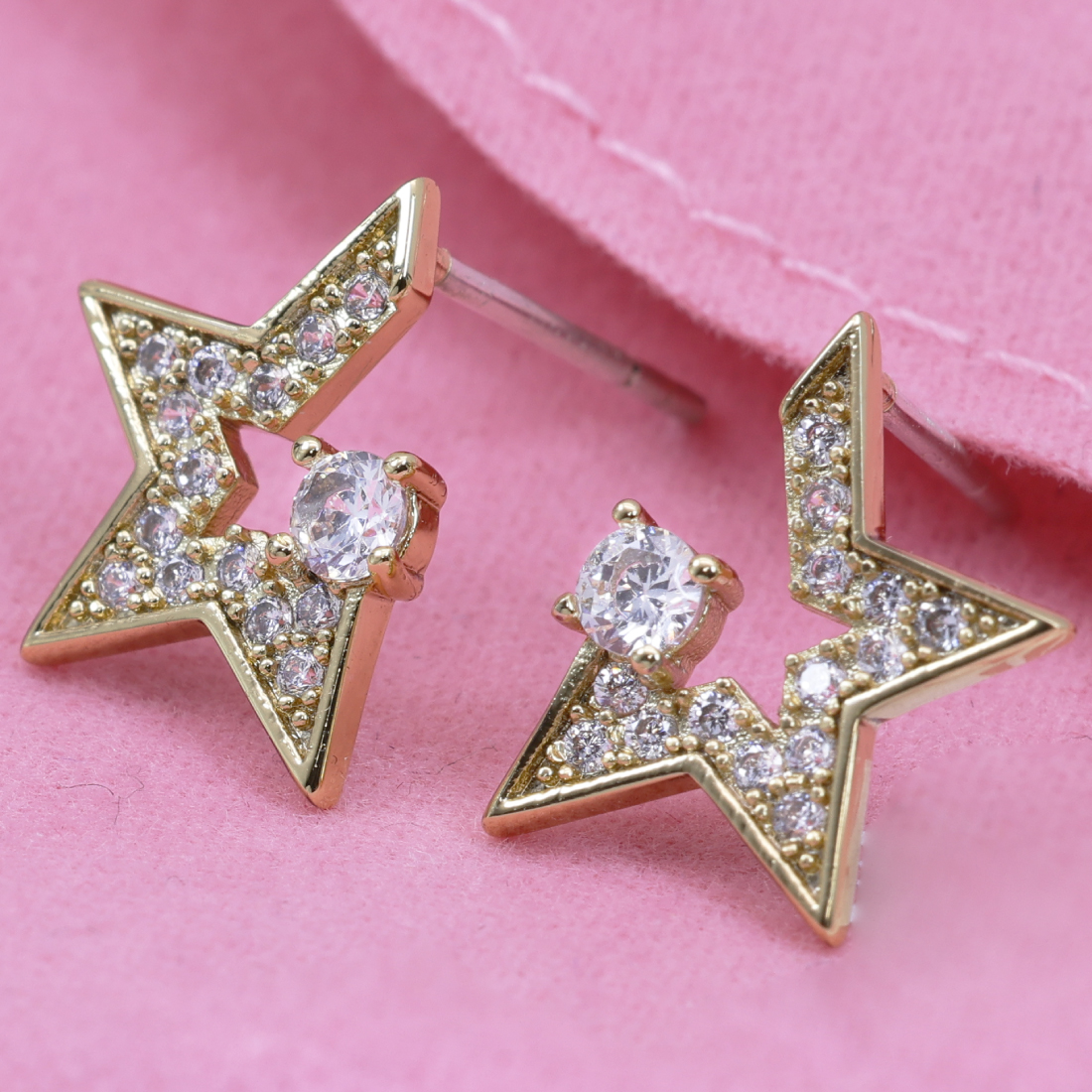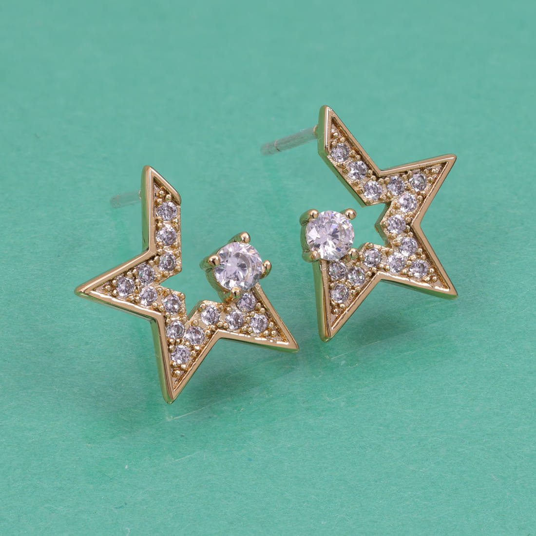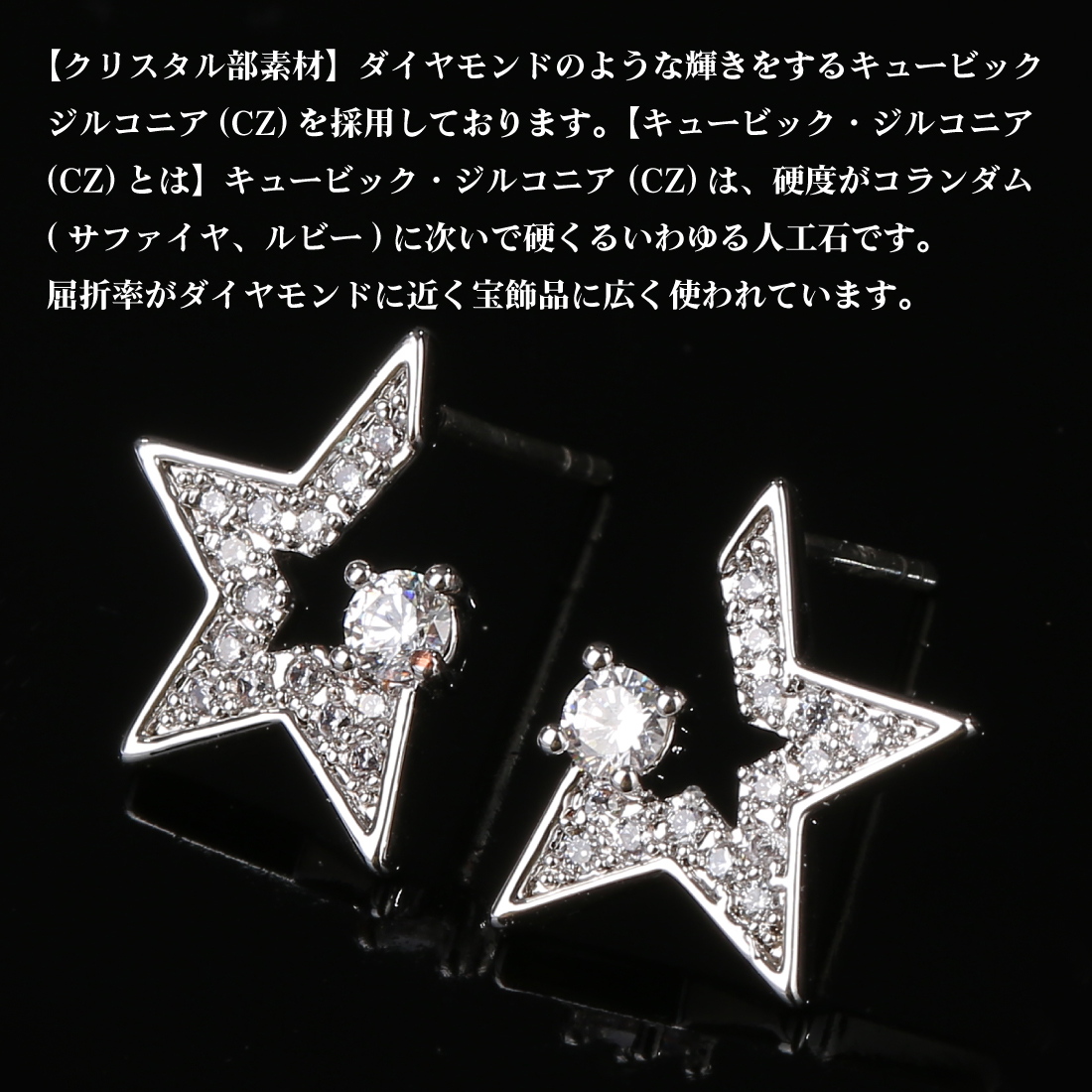 美しい星型にジルコニアを敷き詰めた洗練されたデザインが特徴です。高級感あふれる輝きを楽しむことができるため、贈り物にもおすすめです。ボディーは美し光沢の金メッキでポストはスターリングシルバーを採用し耳に優しい素材となっています。