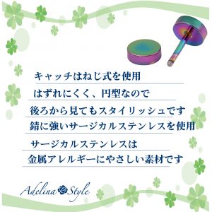 ステンレススタッドピアスは医療用として一般に知られているサージカルステンレスを使用しております。アレルギーを引き起こしにくい素材ですのでデリケートな肌質の方にもおすすめです。傷がつきにくくサビにくいので汗や皮脂などで汚れても酸化しないためアレルギーの原因となる金属が溶け出さず肌荒れがおきにくくなっております。