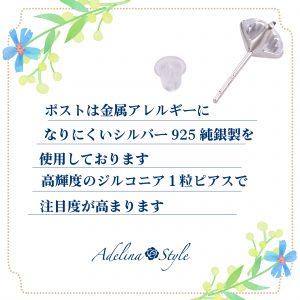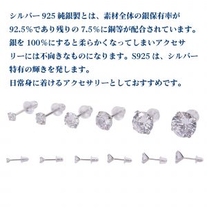 ポスト素材はアレルギーになりにくいシルバー925を採用しております。シルバー925とは92.5%が銀、残りの7.5%が銅などの合金でできた銀製品のことです。純銀に比べて硬度が高く強度があり変色しにくいためジュエリーやアクセサリーなどに広く使用されています。シルバー925のピアスは銀の光沢感とシンプルなデザインが魅力で耳元を上品に演出してくれます。